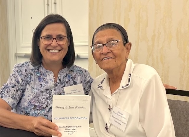Last week, Sister Miriam Tiburcio, RSHM, was honored at a special luncheon for all volunteers who assist travelers at Los Angeles International Airport. For many years, she has faithfully served those in need, offering a welcoming presence and a helping hand.The theme of the celebration, “Planting the Seeds of Kindness,” beautifully reflects Sister Miriam’s spirit and dedication. She invited Sister Luísa Almendra, RSCM, a visiting professor from Portugal who is teaching this year at Loyola Marymount University, to share in this joyful occasion.