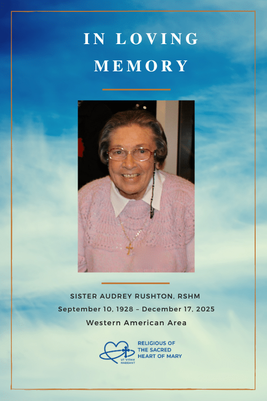 A Religious of the Sacred Heart of Mary for 78 years, Sister Audrey Rushton died peacefully on December 17, 2025, at the age of 97, at Regina Residence in Orange, CA. Sr. Audrey was one of five children born to Catherine and Rowland Rushton in Los Angeles, CA. She is predeceased by her parents, her brothers, Ted and Rowland, and her sister, Sister Yvonne Rushton, who was also a member of the Religious of the Sacred Heart of Mary. She is survived by her younger sister, Sister Renée Rushton, RSHM, and many cousins, nieces and nephews.
